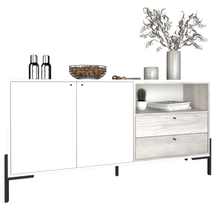 Cuenta con 2 puertas con bisagras metálicas y 2 cajones con correderas, ideales para almacenar vajilla, manteles o lo que necesites tener organizado y fuera de la vista. Incluye tiradores metálicos y un estante interno, todo con un diseño cuidado hasta el último detalle.