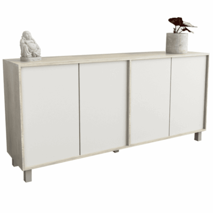 Cuenta con 4 puertas con sistema push, que aportan una apertura cómoda y minimalista sin tiradores a la vista. En su interior incluye 2 estantes, ideales para guardar vajilla, mantelería o elementos de uso cotidiano. Su estructura está fabricada en melamina de alta resistencia, con bisagras metálicas y patas plásticas con acabado en laca UV, lo que le otorga estabilidad, durabilidad y un estilo limpio y contemporáneo.