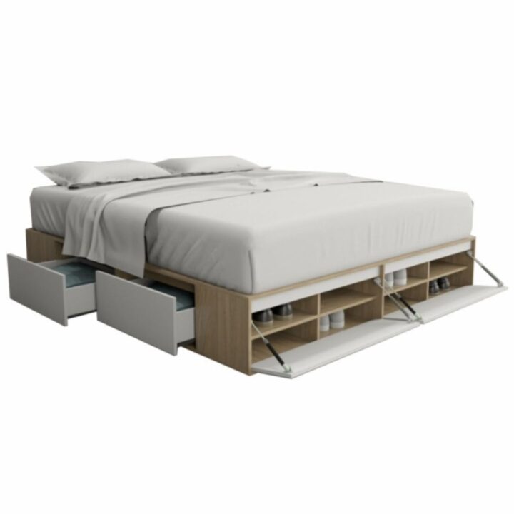 Incluye 4 cajones con interiores revestidos, perfectos para almacenamiento extra, más 2 puertas en la piecera con pistones neumáticos que revelan espacio tipo baúl. También cuenta con 4 estantes y una repisa en la piecera, brindando soluciones inteligentes para mantener el orden.