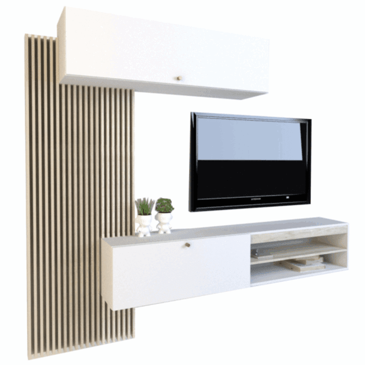 Incluye dos módulos con puertas abatibles que se abren suavemente gracias al doble pistón a gas en cada una, dos estantes abiertos para dispositivos o decoración, y un espacio central amplio para ubicar TVs de hasta 55” (aproximadamente).