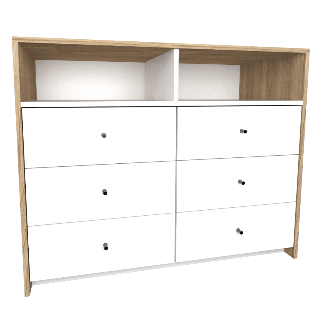Cuenta con 6 cajones espaciosos con correderas metálicas que aseguran un deslizamiento suave y duradero, y 2 estantes abiertos ideales para objetos de uso frecuente o decoración. Gracias a su altura, también puede usarse como soporte para TV o para organizar juguetes, libros o accesorios.