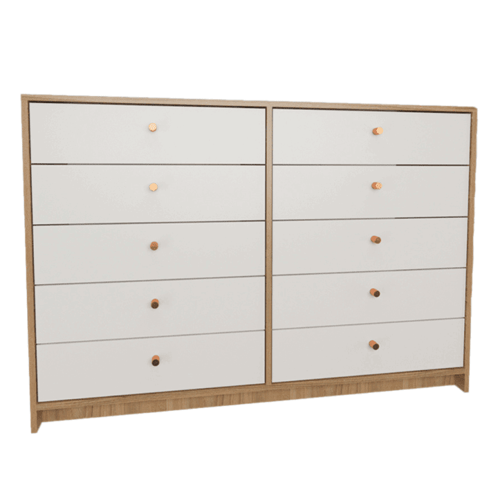 El Chifonier de la Línea Senior, con sus 10 cajones, es la solución ideal para quienes buscan máxima capacidad de guardado sin resignar diseño. Su estructura está fabricada en MDP de 15 mm de espesor, revestido en melamina de alta resistencia, lo que asegura durabilidad y una excelente terminación.