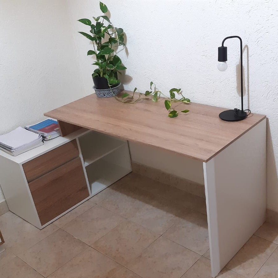 Súper resistente y práctico para trabajar, lo armé esquinero. La melamina es de buena calidad, se limpia fácil (ya se me cayó el mate jaja). Los cajones corren joya gracias a las guías metálicas. Recomendadísimo!!