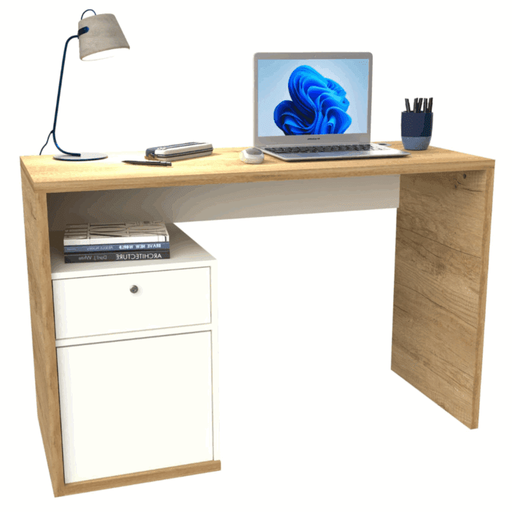 Fabricado en melamina MDP de 25 y 15 mm, con fondo en MDF de 3 mm, este escritorio es robusto y duradero. Además, incluye cerradura en el cajón, ideal para mantener tus pertenencias seguras. Una opción ideal para oficina o estudio.