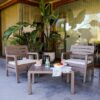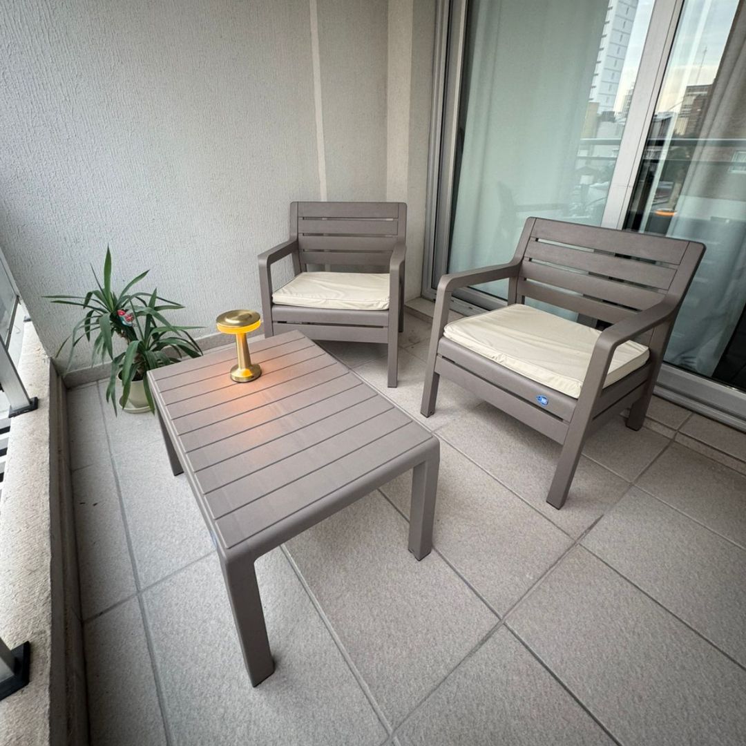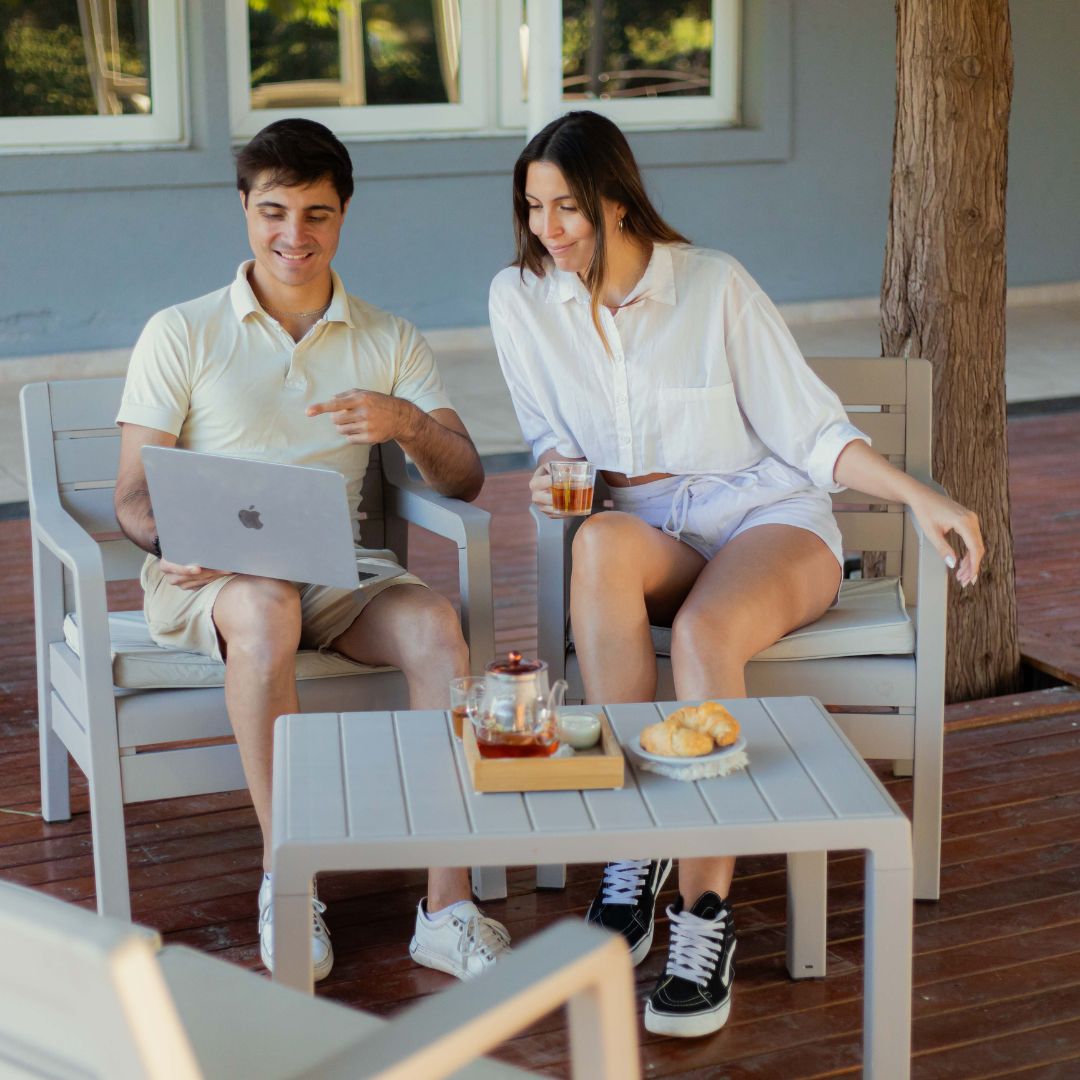 El set está compuesto por 2 sillones de un cuerpo y 1 mesa central, todos con tacos antideslizantes que brindan estabilidad en distintas superficies. Su diseño moderno y funcional lo convierte en una opción perfecta para jardines, balcones, galerías o livings de exterior, aportando calidez y practicidad al ambiente.