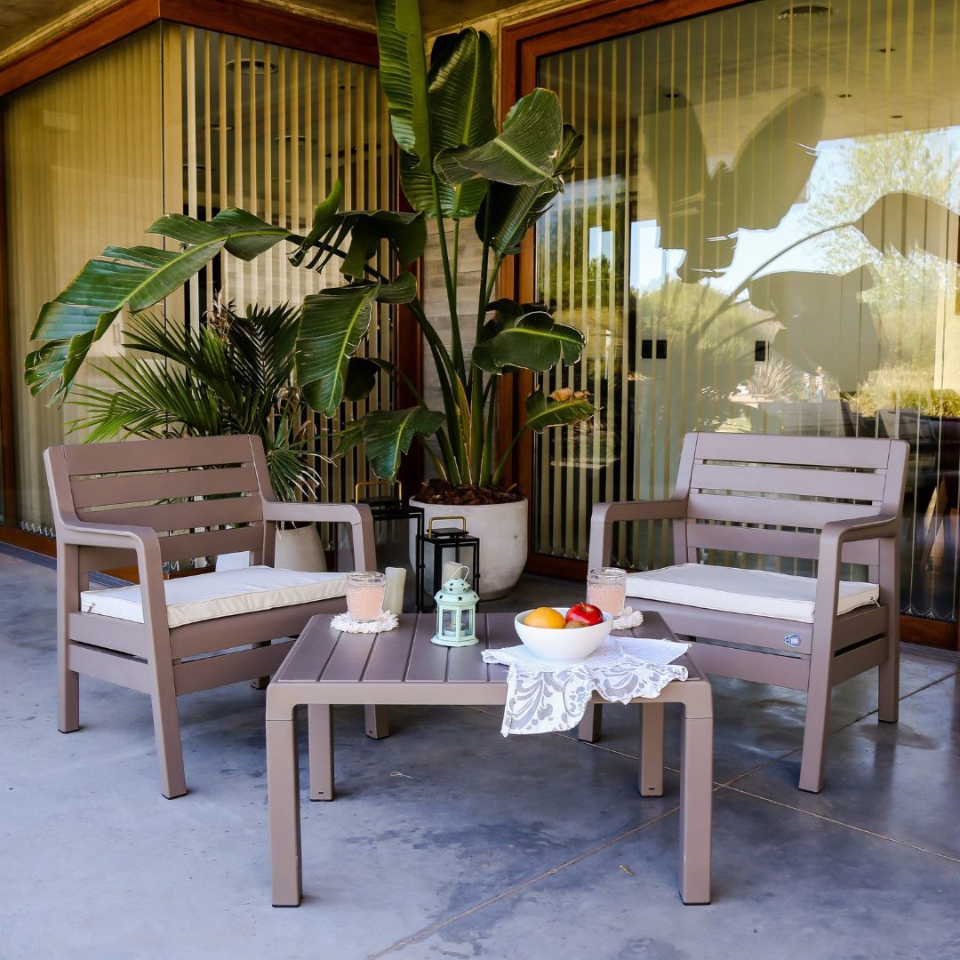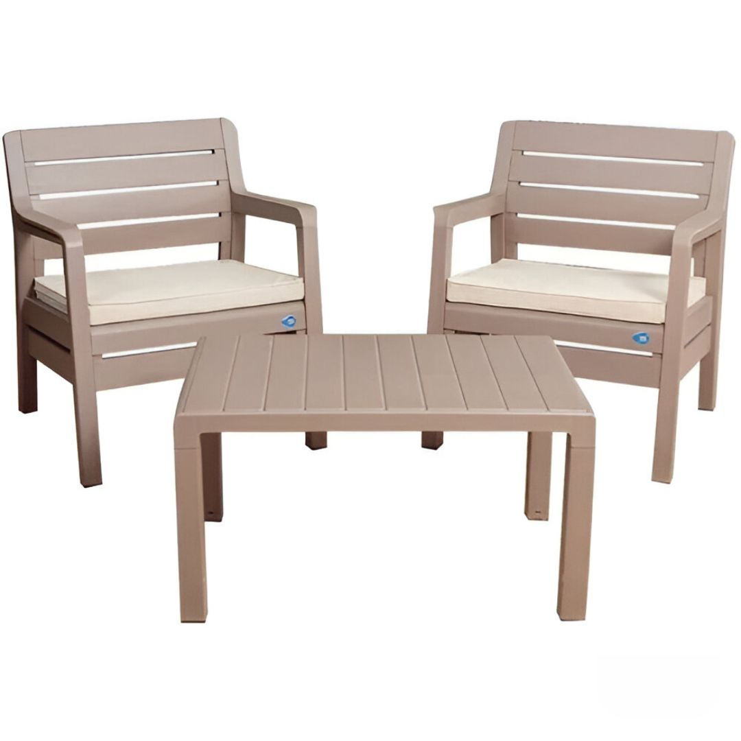 Este conjunto de sillones y mesa es el complemento ideal para tu espacio, ofreciendo confort y estilo en cada detalle. Fabricado en plástico color capuchino, combina resistencia y practicidad, soportando hasta 135 kg por sillón y 30 kg en la mesa. Incluye almohadones de tela impermeable para mayor comodidad y durabilidad, pensados para acompañarte en cualquier temporada.