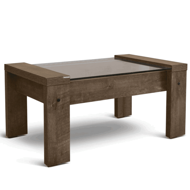 Está construida en melamina sobre aglomerado de 25 mm y cuenta con un cajón interno oculto que se revela al elevar la tapa. El vidrio de 8 mm en la superficie le aporta un detalle moderno, además de permitir ver el espacio interior donde podés guardar objetos decorativos o de uso cotidiano.