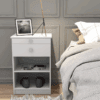 Fabricada en melamina de alta resistencia, garantiza durabilidad y fácil mantenimiento. Su cajón con interior revestido brinda un espacio útil para guardar objetos personales, mientras que el estante inferior aporta capacidad extra de almacenamiento. Incluye correderas metálicas para un deslizamiento suave y tirador en aluminio anodizado que suma un toque de elegancia.