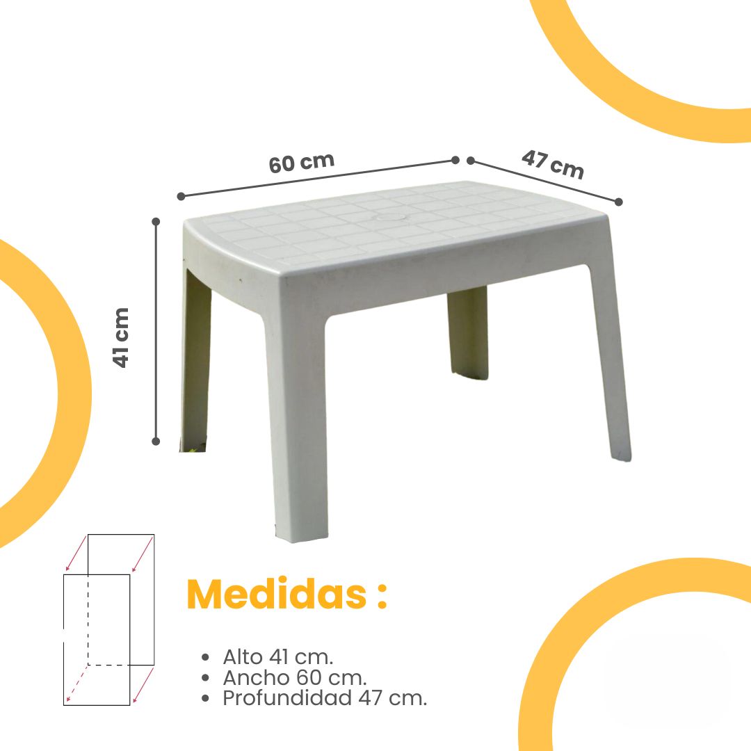 Gracias a su tratamiento con filtro UV y filtro de luz, conserva sus propiedades y colores sin degradarse, incluso bajo exposición prolongada al sol. Con un diseño simple y funcional, esta mesa es liviana, fácil de trasladar y resistente a la intemperie, convirtiéndose en una alternativa versátil y duradera para tus momentos de relax.
