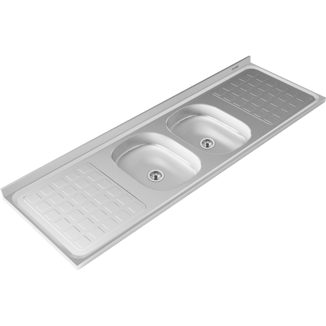 La Mesada de Acero Inoxidable de 1,60 m ofrece una superficie amplia y funcional para cocinas que requieren eficiencia y comodidad. Con doble bacha, escurridor lateral y respaldo reforzado, brinda una solución completa para el lavado y preparación de alimentos.