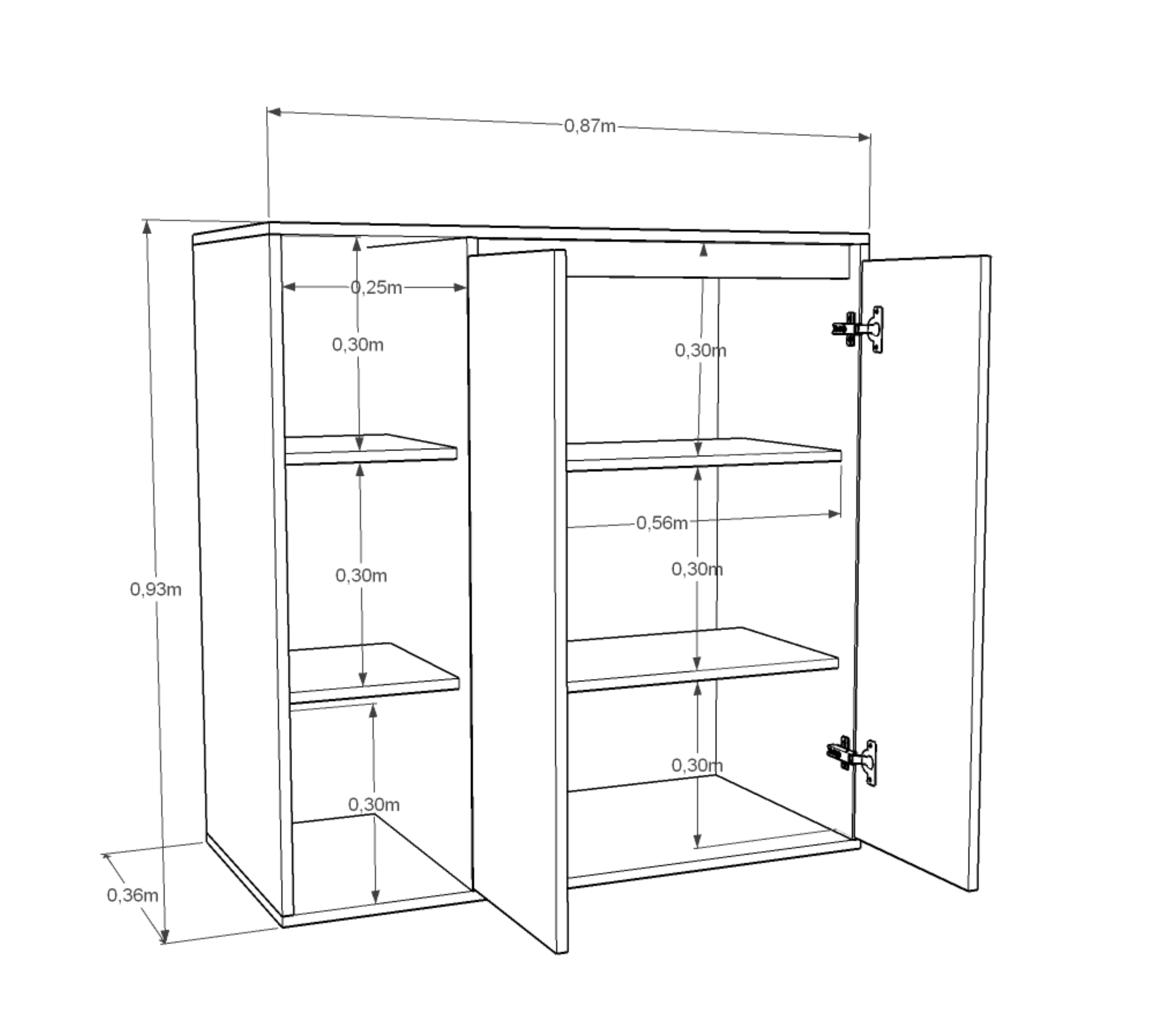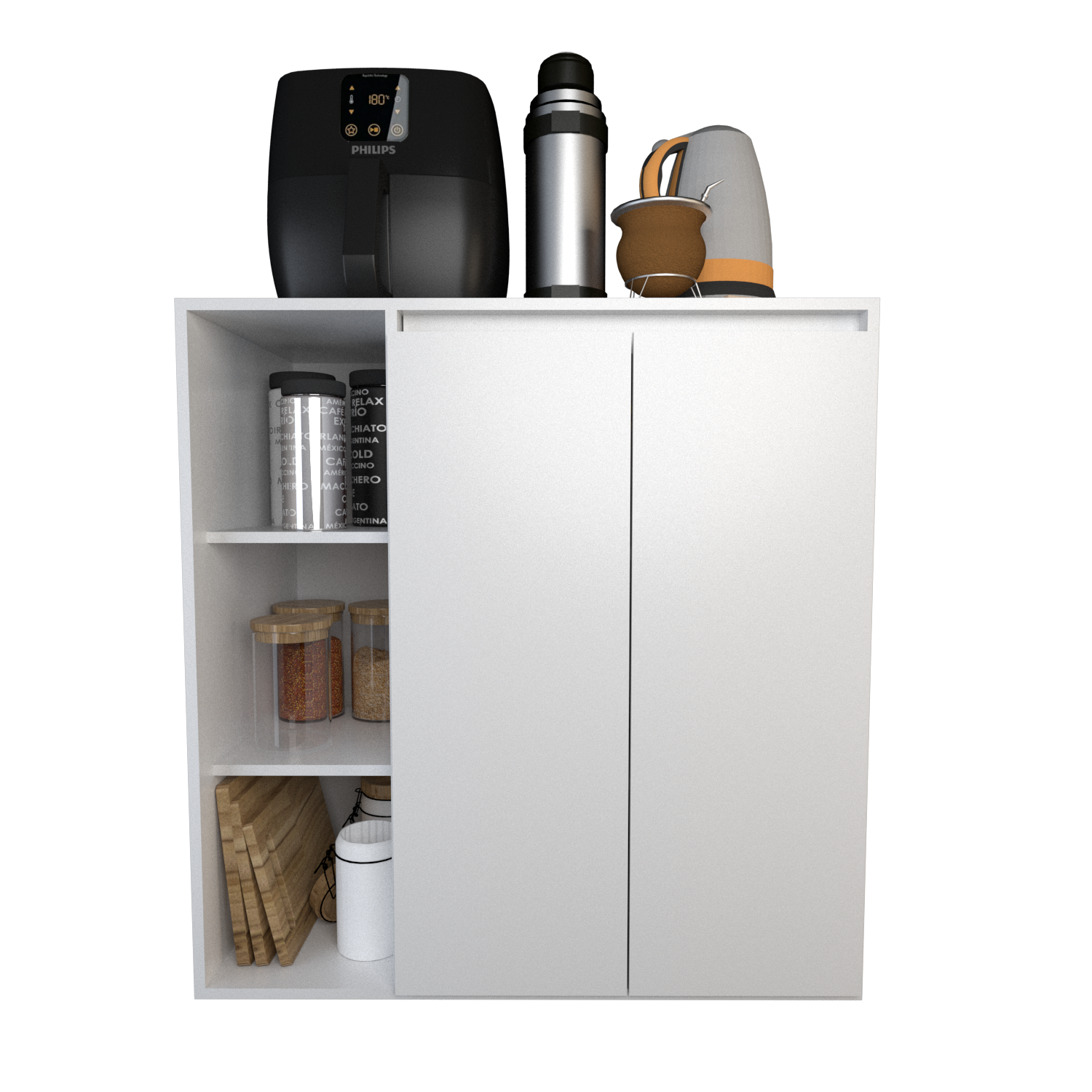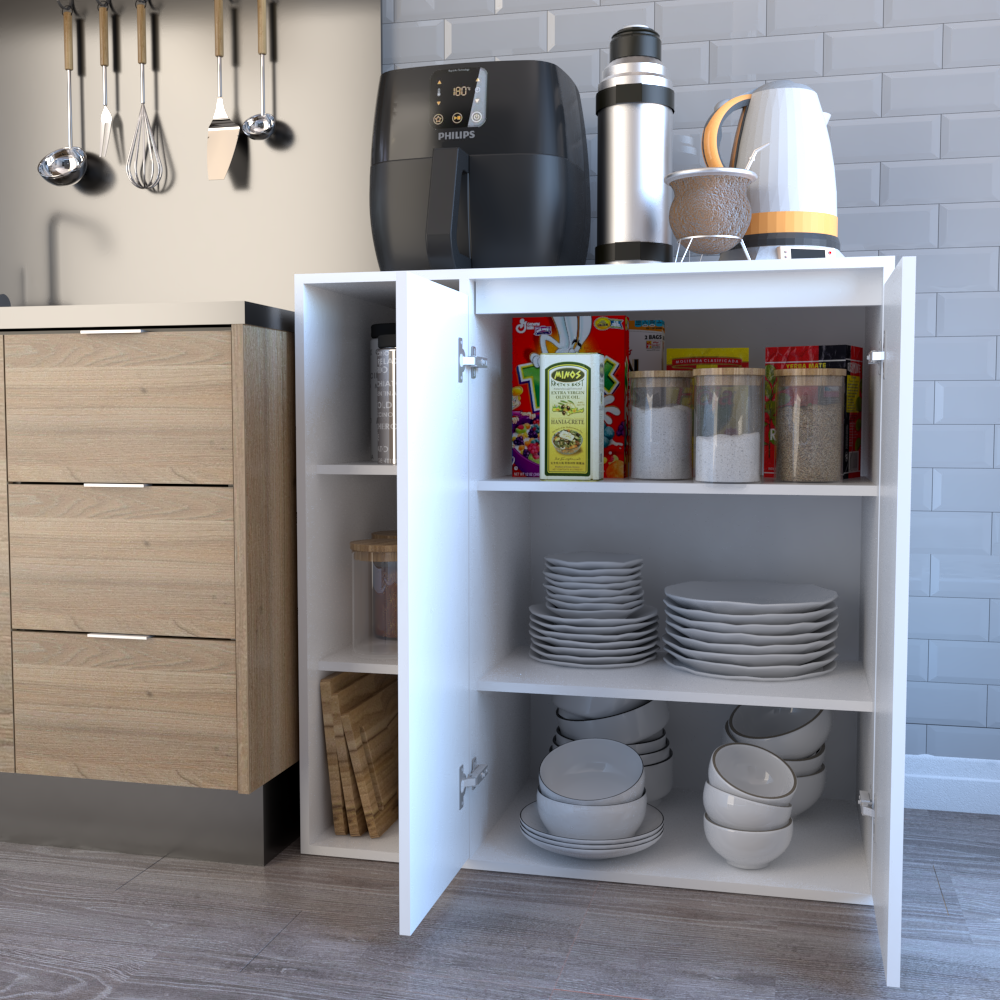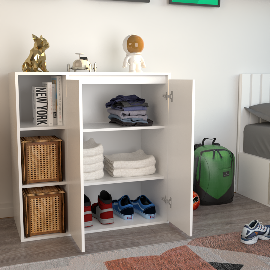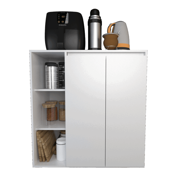 Cuenta con cuatro estantes internos y dos puertas que protegen los objetos del polvo y permiten mantener el orden de manera discreta. Su diseño simple y funcional, en color blanco, se adapta fácilmente a cualquier estilo de decoración y necesidad de almacenamiento. Ideal para quienes buscan practicidad y organización en un solo mueble.