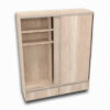 Está construido en melamina de primera calidad, con herrajes en aluminio, puertas corredizas con guías metálicas, dos puertas laterales y tres amplios cajones inferiores, uno de ellos con cerradura con llave. Además, cuenta con barras para colgar ropa y estantes internos, pensado para quienes buscan organización y estilo en un solo mueble.