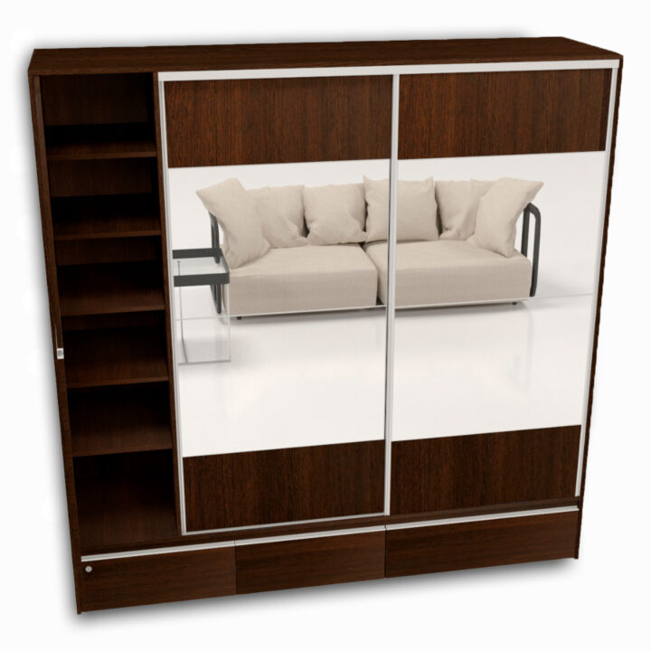 Construido en melamina de alta calidad, cuenta con herrajes y guías de aluminio, dos puertas laterales, y tres cajones inferiores accesibles sin abrir las puertas corredizas, uno de ellos con cerradura de seguridad. Su interior ofrece barras para colgar, estantes y cajones amplios, perfectos para una organización práctica y estética.