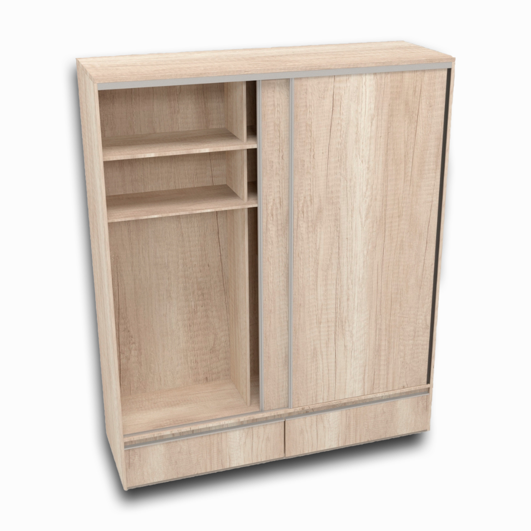 Está equipado con barra para colgar, estantes amplios, y dos cajones inferiores de fácil acceso, uno de ellos con cerradura con llave. Fabricado en melamina de alta calidad y armado con correderas metálicas y herrajes en aluminio, garantiza resistencia y estilo en un mismo producto.