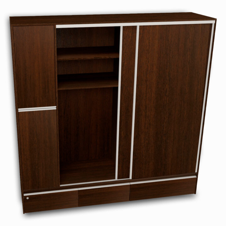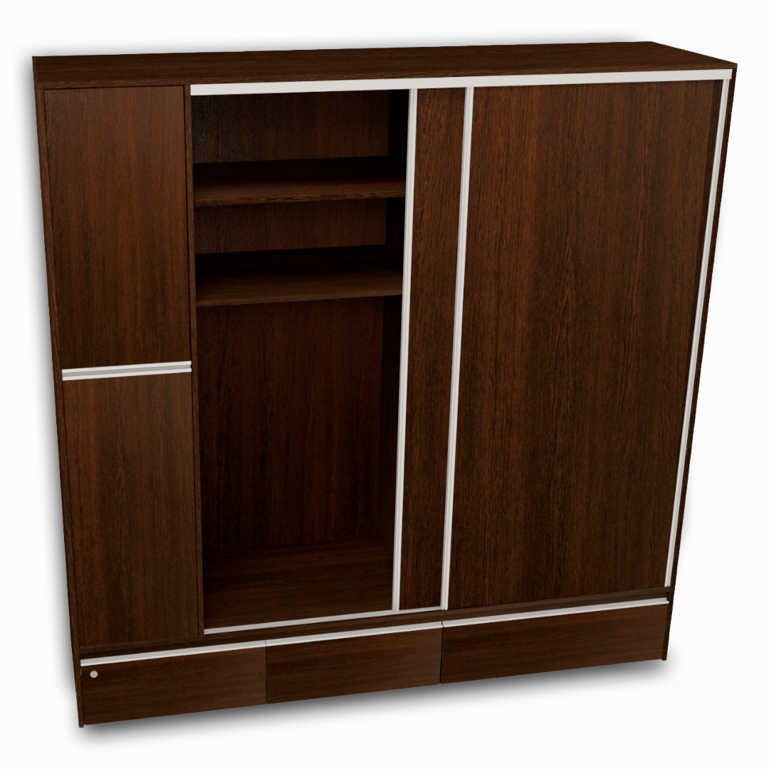 Cuenta con herrajes y guías de aluminio, dos puertas laterales, y tres cajones inferiores accesibles desde el exterior, uno de ellos con cerradura con llave. En su interior incluye barras para colgar, estantes y espacios organizadores, todo diseñado para brindar comodidad y orden en el día a día.