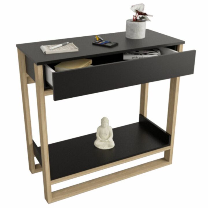 Cuenta con un cajón con sistema push para una apertura más limpia y sin tiradores, y un estante inferior que te permite decorar o guardar objetos de uso diario. Su tamaño es perfecto para complementar tu espacio sin recargarlo.